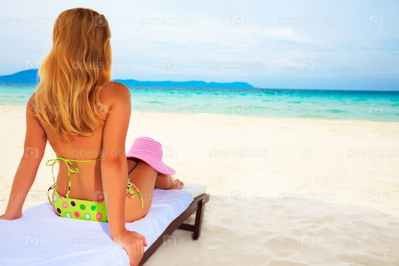 Девушка загорает на шезлонге на берегу океана