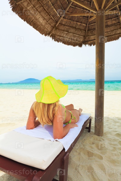 Девушка загорает на шезлонге на берегу океана