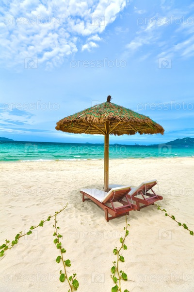 Тропический пляж с шезлонгами
