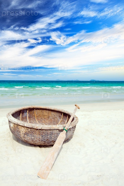 Вьетнамская лодка и весло на берегу океана