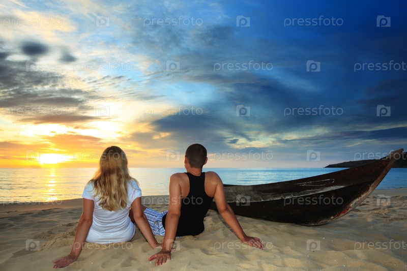 Влюбленная пара и лодка на берегу океана во время заката