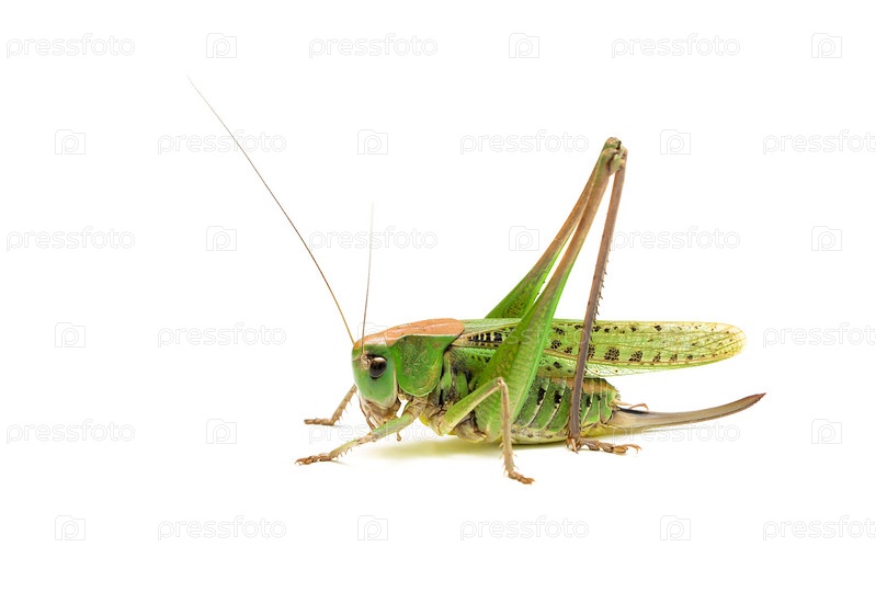 Кузнечик крупным планом на белом фоне
