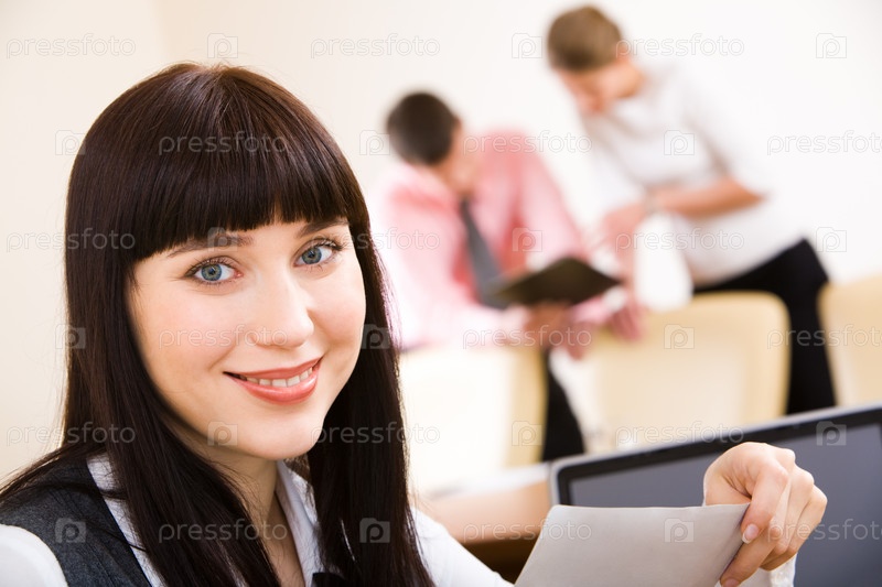 Портрет красивой улыбающейся бизнес-жены, держащей бумагу в рабочей среде