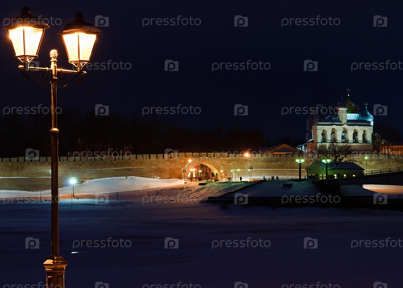 Зимняя набережная реки, ночь