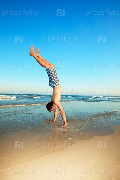 Мужчина стоит на руках на пляже