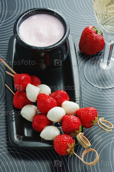 Клубника и моцарелла на шампурах с йогуртом и вином
