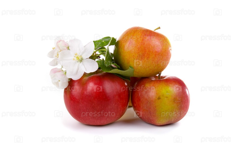 Спелые красные яблоки и ветка цветущей яблони на белом фоне
