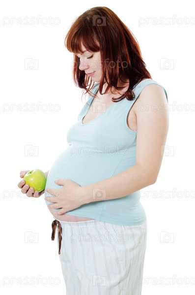 Беременная женщина с яблоком на белом фоне