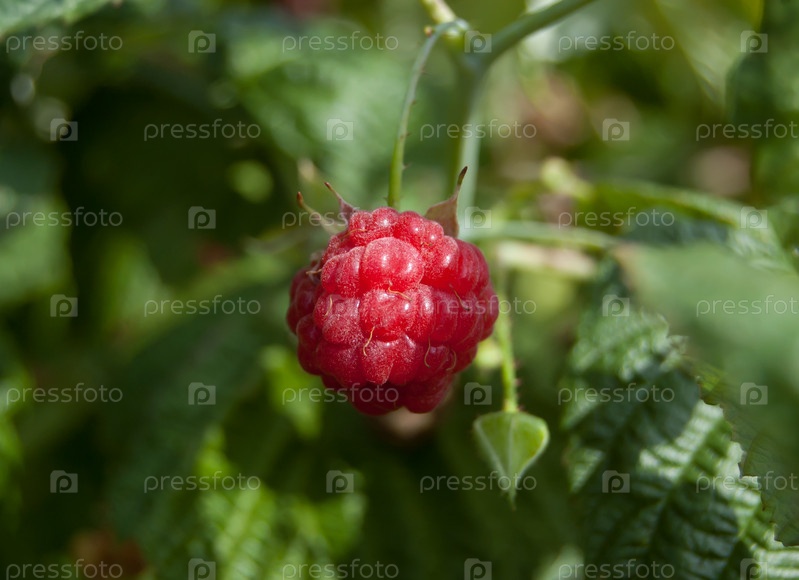 Спелая малина крупным планом на кусту