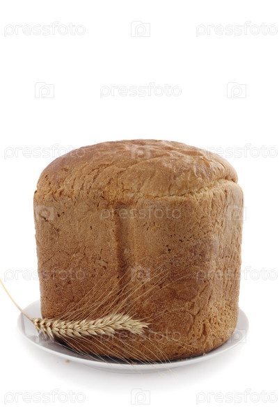 Домашний хлеб и колос пшеницы на тарелке белом фоне