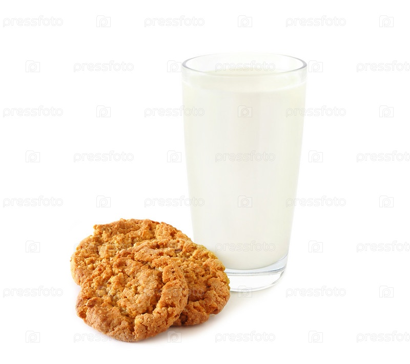 Овсяное печенье и стакан молока на белом фоне