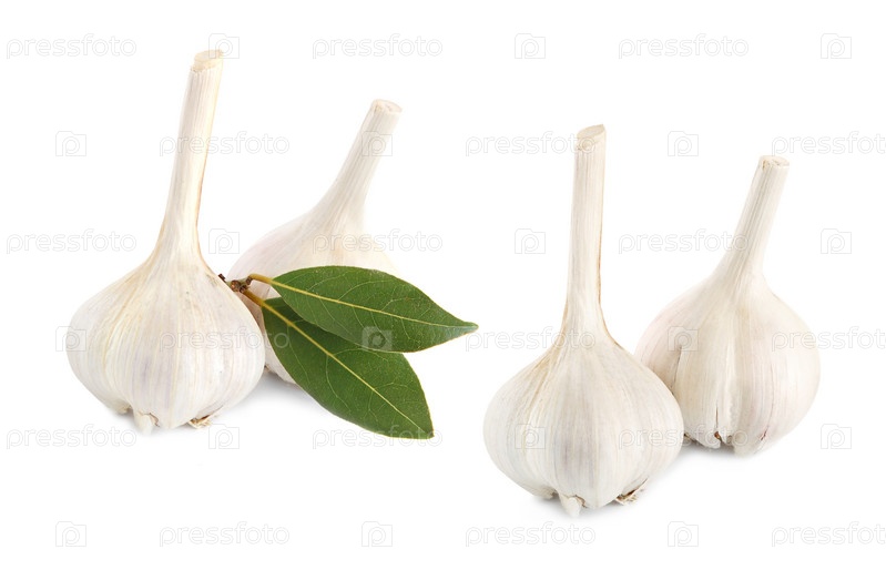 Свежие лавровые листья и головки чеснока на белом фоне