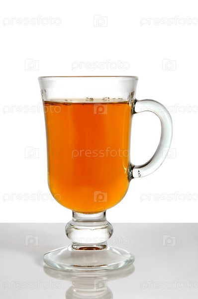 Горячий чай в стеклянном бокале на белом фоне