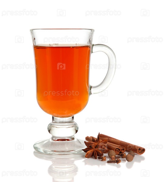 Горячий чай в стеклянном бокале и специи на белом фоне