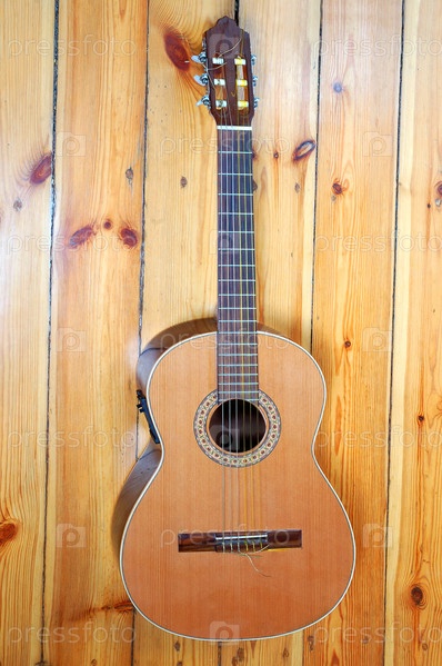 Акустическая классическая гитара на деревянной стене