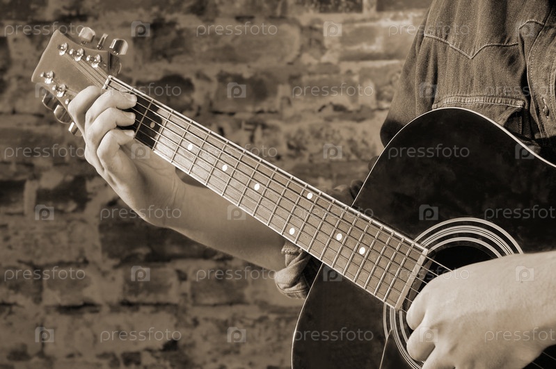 Игра на акустической гитаре на фоне стены