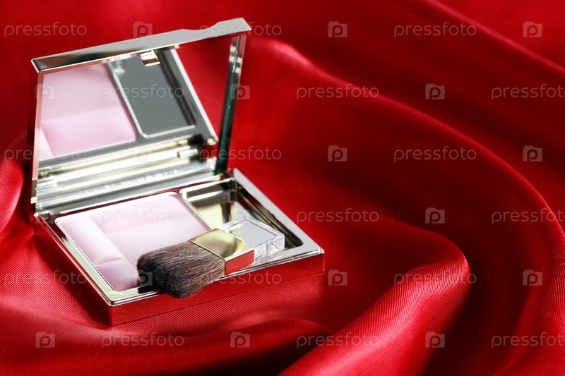 Открытая коробочка румян на красном шелке