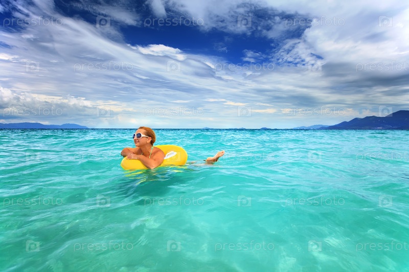Девушка плавает со спасательным кругом в море