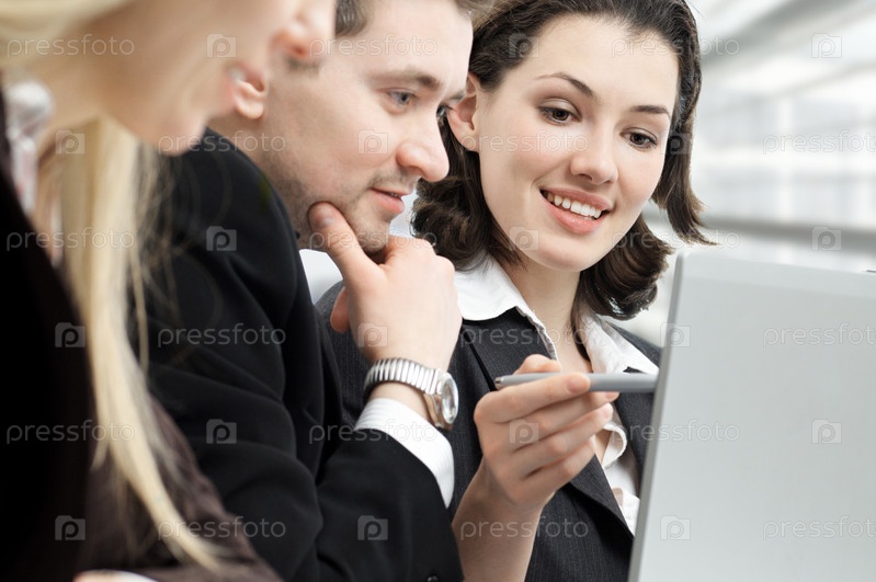 Команда бизнесменов смотрит в ноутбук