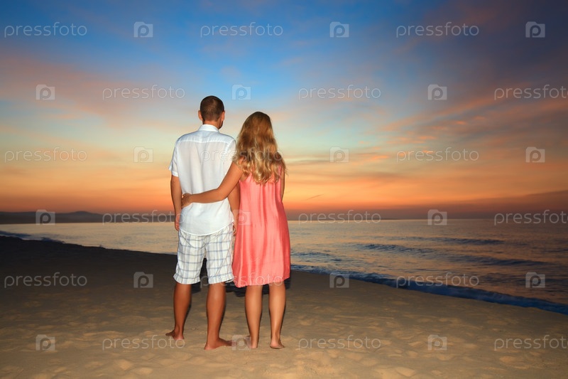 Пара стоит на пляже, смотря на рассвет