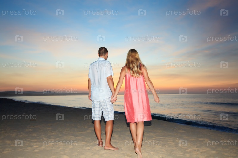 Пара прогуливается по пляжу на рассвете