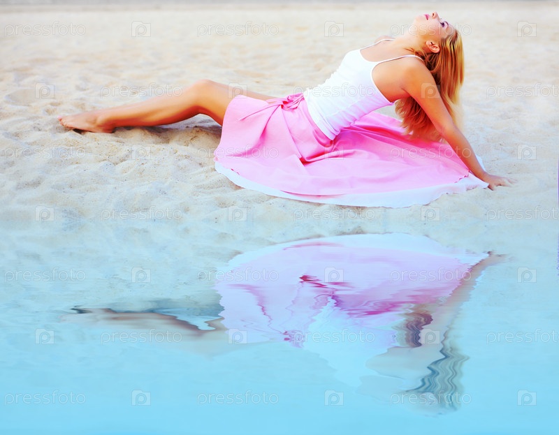 Красивая женщина сидит на пляже и отражается в морской воде