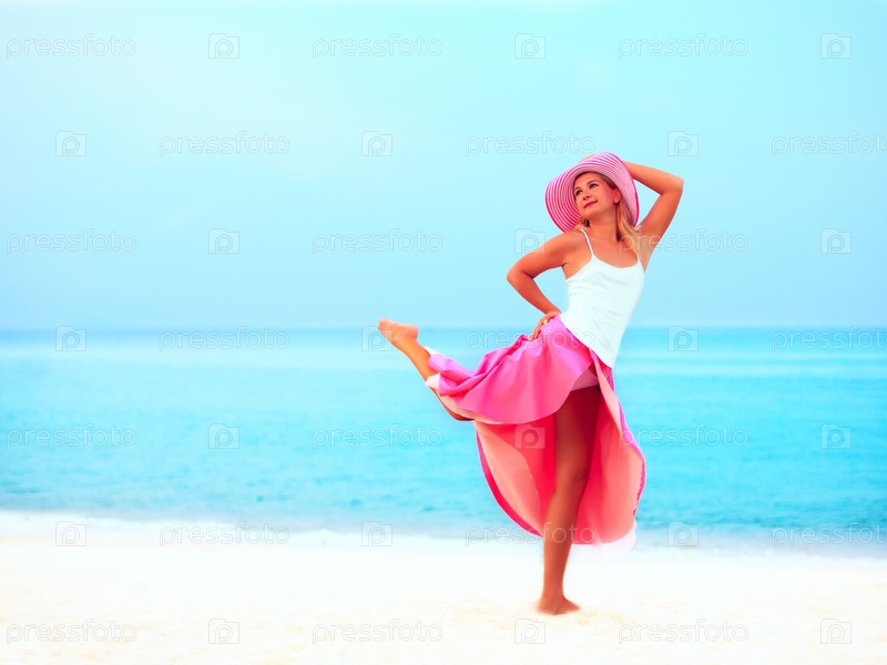 Красивая женщина танцует на морском пляже