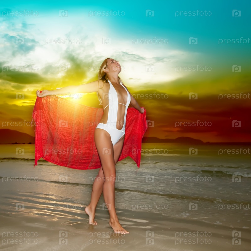 Девушка в купальнике с саронгом идет по морскому пляжу вечером