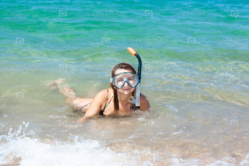 Девушка в водолазной маске лежит в море у берега