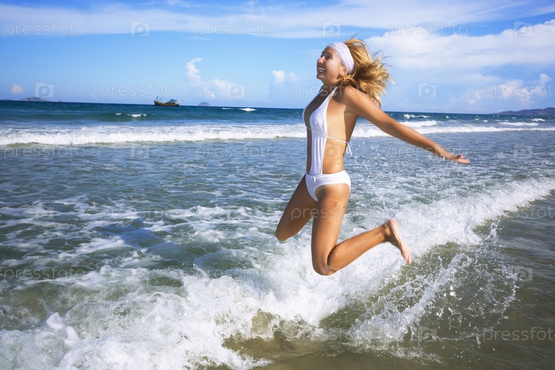 Девушка прыгает на морском пляже