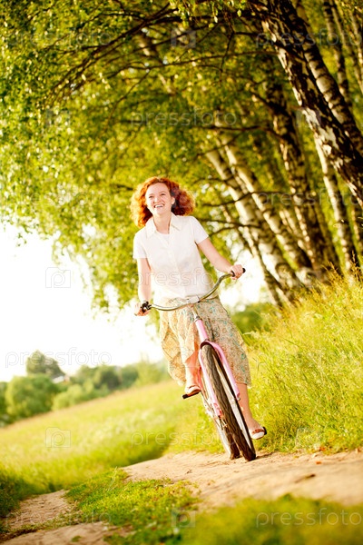 Молодая женщина на велосипеде в летнем лесу