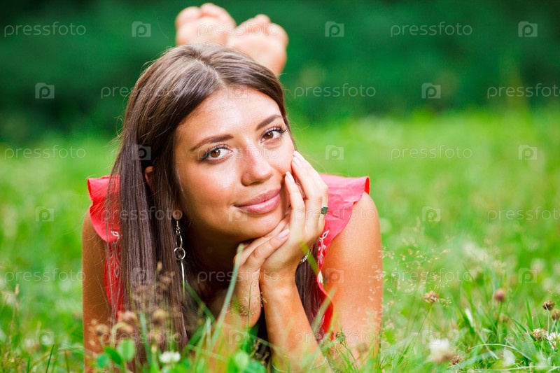 Молодая девушка лежит на траве