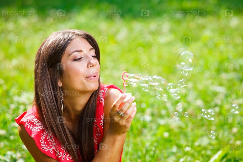 Красивая женщина дует мыльные пузыри