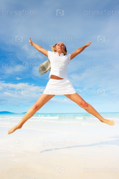 Девушка прыгает на морском пляже