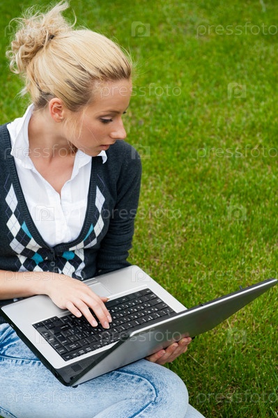 Молодая девушка с ноутбуком сидит на зеленой траве