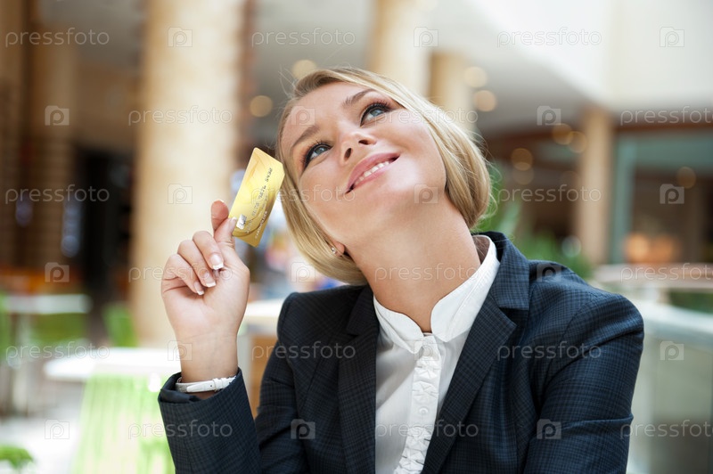 Молодая девушка держит в руках кредитную карту и мечтает