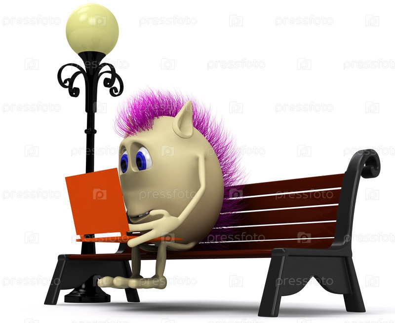 Мультипликационный человечек сидит на скамейке с ноутбуком на белом фоне