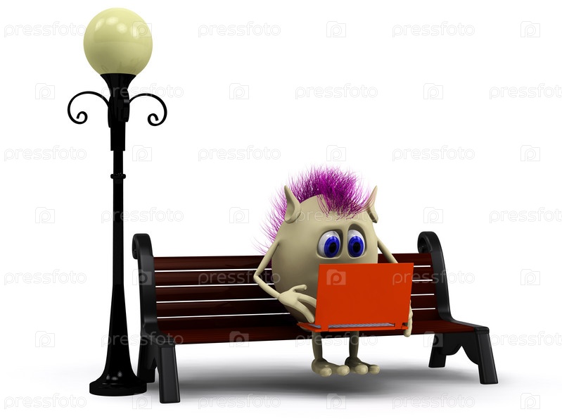 Мультипликационный человечек сидит на скамейке с ноутбуком на белом фоне