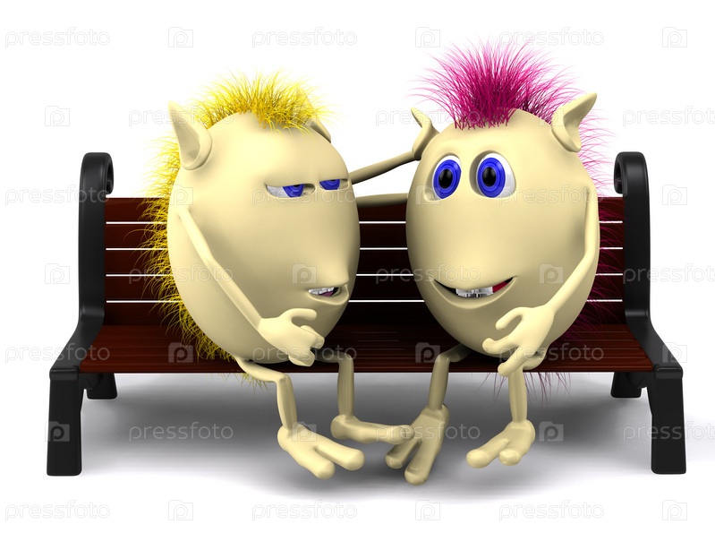 Два мультипликационных человечка сидят на скамейке на белом фоне
