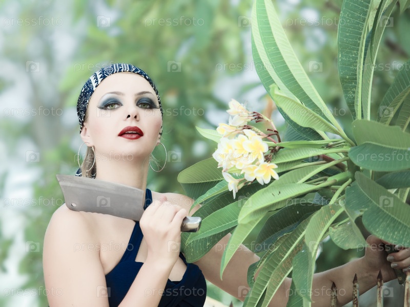 Портрет красивой женщины с ножом в саду