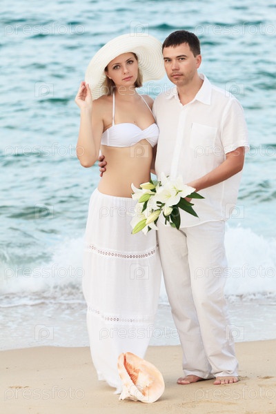 Молодая пара в белой одежде на берегу океана