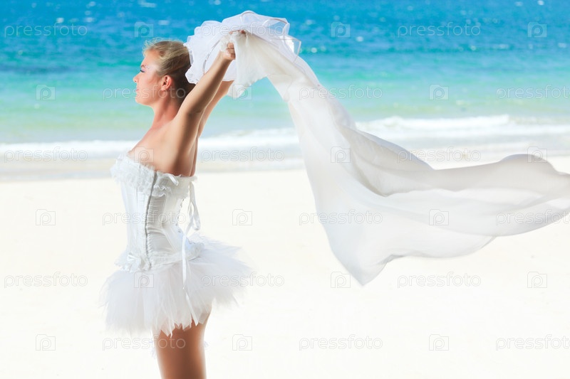 Счастливая невеста на берегу океана