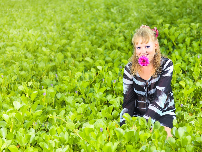 Красивая женщина в траве с герберой