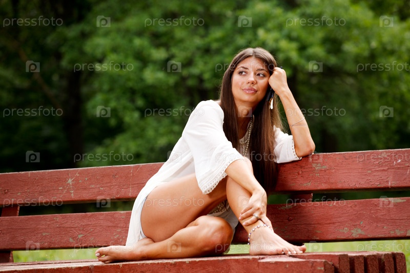 Красивая молодая девушка, сидящая на скамейке в парке