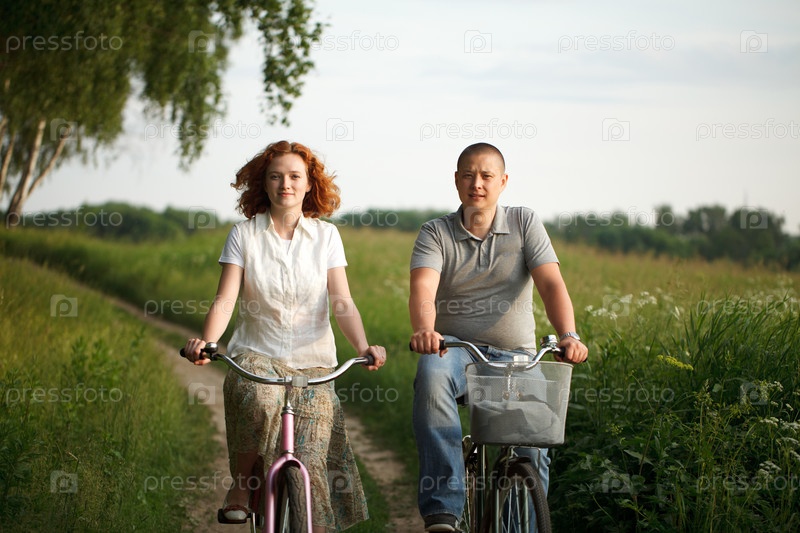 Счастливая молодая пара, катающаяся на велосипедах