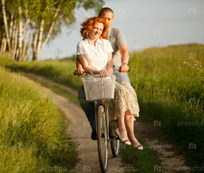 Счастливая молодая пара, катающаяся на велосипеде