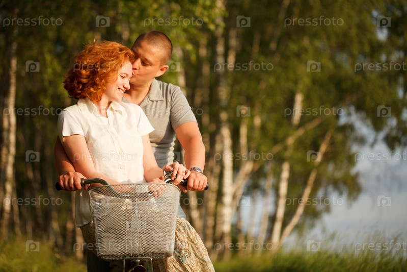 Счастливая молодая пара, катающаяся на велосипеде