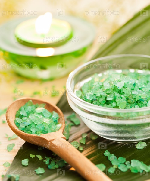 Морская соль, свеча и зеленый лист на столе