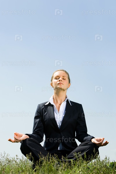 Портрет красивой бизнес-леди, сидящей на траве и занимающейся упражнениями йоги