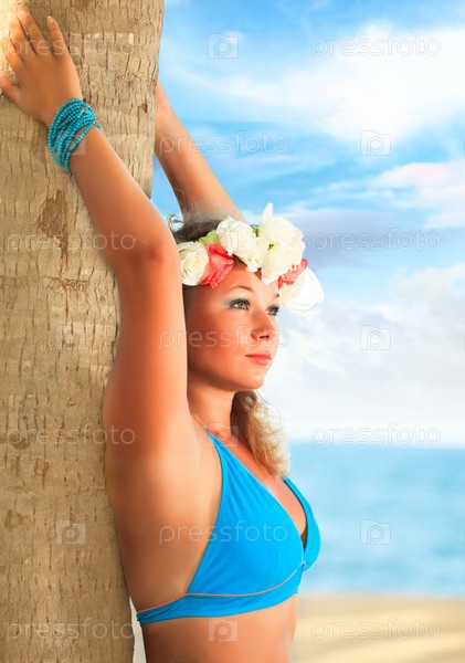 Молодая женщина с венком на голове стоит у дерева на пляже